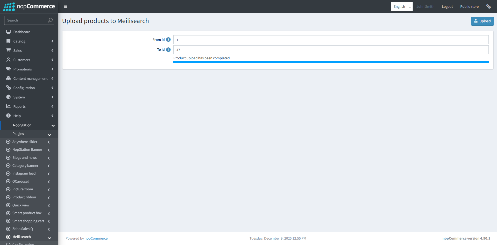 - Go to Admin → Nop Station → Plugins → Meili Search → Upload Products