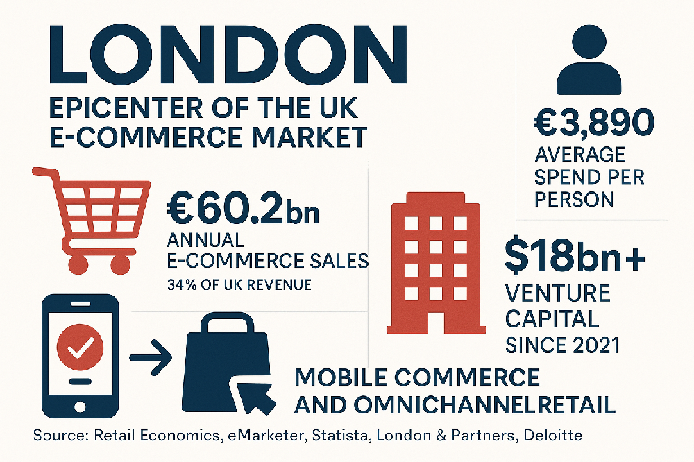 London serves as the undeniable epicenter of the UK's e-commerce market, generating an estimated £60.2 billion in annual sales, which represents a commanding 34% of the nation's total e-commerce revenue (Retail Economics). This dominance is fueled by a combination of high consumer spending, averaging approximately £3,890 per person annually (eMarketer), and a concentrated business environment. The city is home to over 67,617 e-commerce companies, giving it a 39% market share of all UK e-commerce businesses (BoldData). Furthermore, London is a major hub for digital investment, attracting significant venture capital into its digital retail and technology sectors (London & Partners). The city drives advanced UK digital trends, including a high reliance on mobile commerce and rapid adoption of sophisticated omnichannel retail strategies, integrating online and physical shopping experiences (Salesforce).